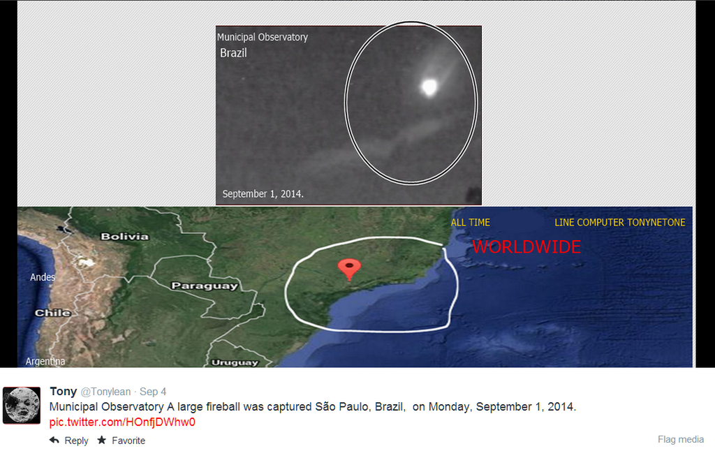 Municipal Observatory A large fireball was captured São Paulo, Brazil, on Monday, September 1, 2014. Embedded image permalink